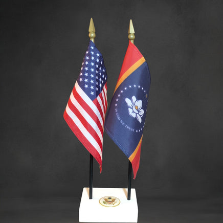 This high quality state and American miniature flag desk set is perfect for office, classroom and table decorations. Deluxe desk and table flags measure 4″x6″ and are attached to a 10″ black plastic staff with a gold spear top. Each flag is hem stitched on all 4 sides and is made of silk-like rayon. Flags come with a two hole white ARCTICSNO deluxe flag stand with an embedded USA great seal. The stand is manufactured by veterans in our facility.
